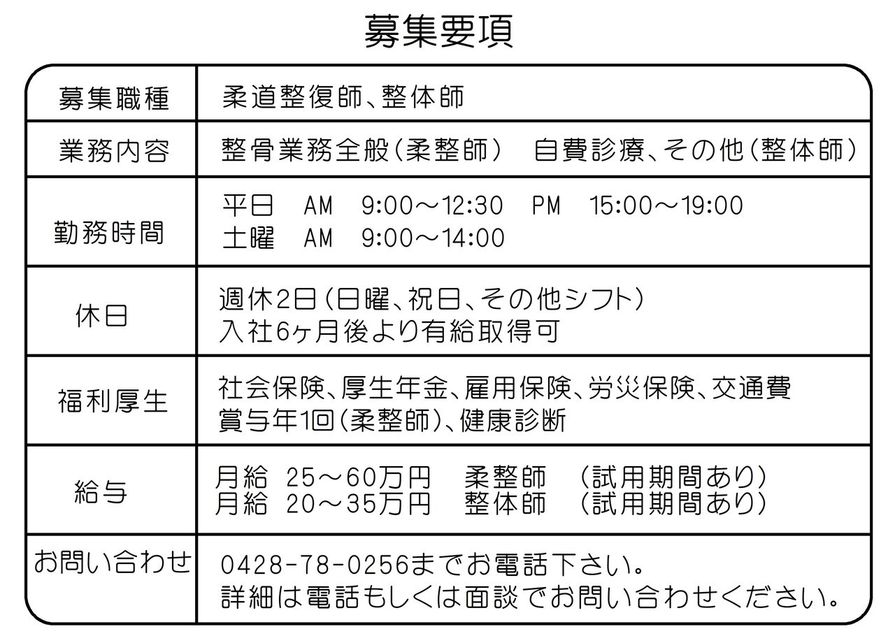 青梅なないろ整骨院の求人について、ご不明な点等ございましたら、